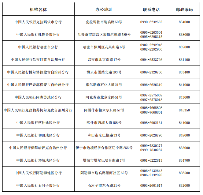 中国人民银行新疆维吾尔自治区分行辖内地州市分行简介